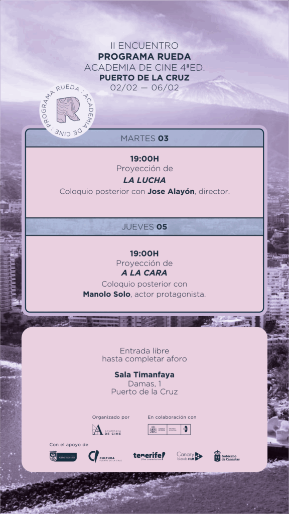 Puerto de la Cruz se sitúa nuevamente como punto de encuentro del cine emergente con la llegada, por cuarto año consecutivo, del Programa Rueda de la Academia de Cine, del 2 al 6 de febrero, una iniciativa de ámbito estatal que consolida al municipio como un entorno dinámico para la creación, la reflexión y el impulso cultural vinculado al sector audiovisual.