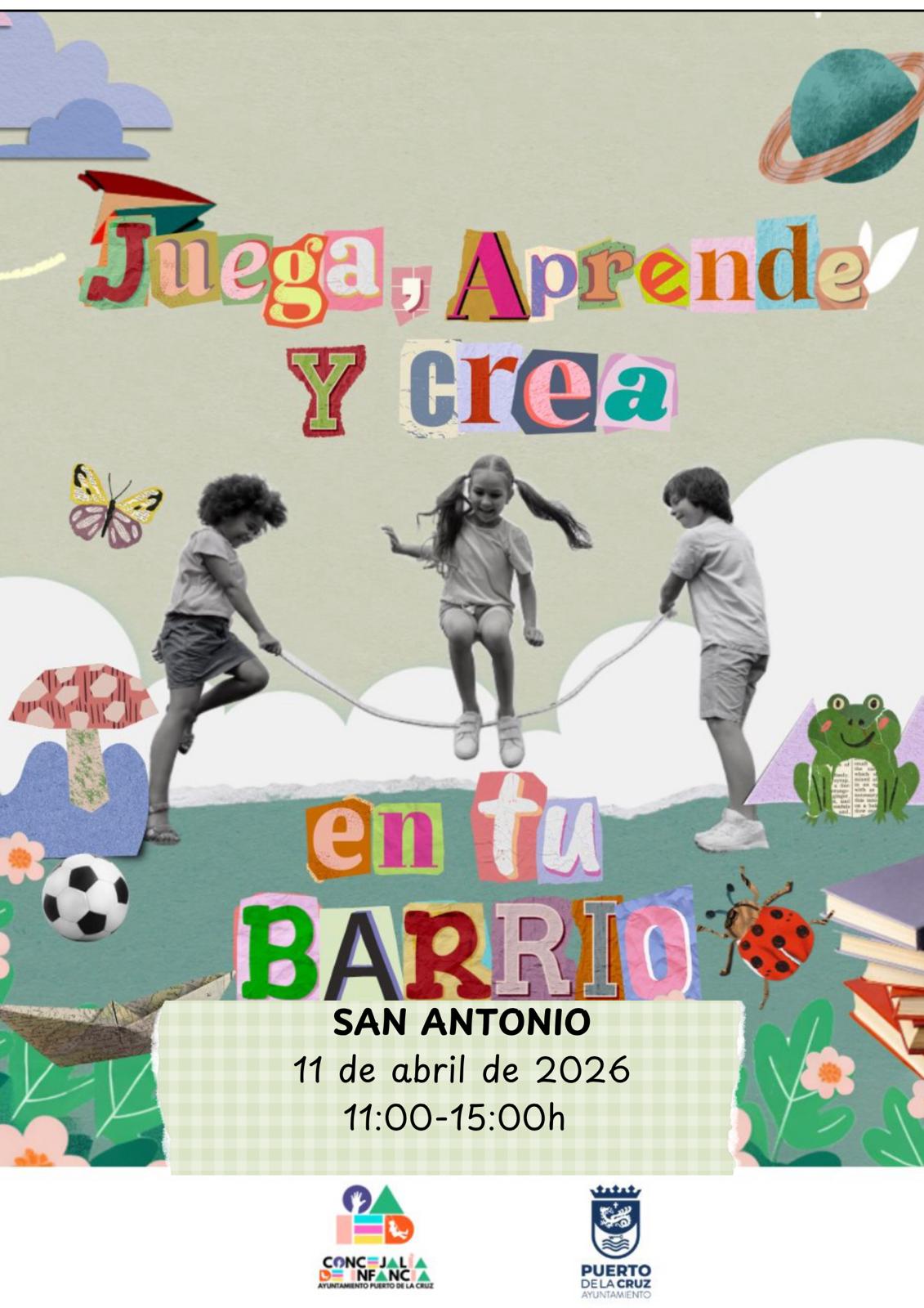 La concejalía de Infancia organiza el nuevo Juega, Aprende y Crea en tu barrio. Este sábado, te esperamos en San Antonio, con muchas actividades y castillos hinchables para los niños y niñas. Entrada gratuita hasta completar aforo.