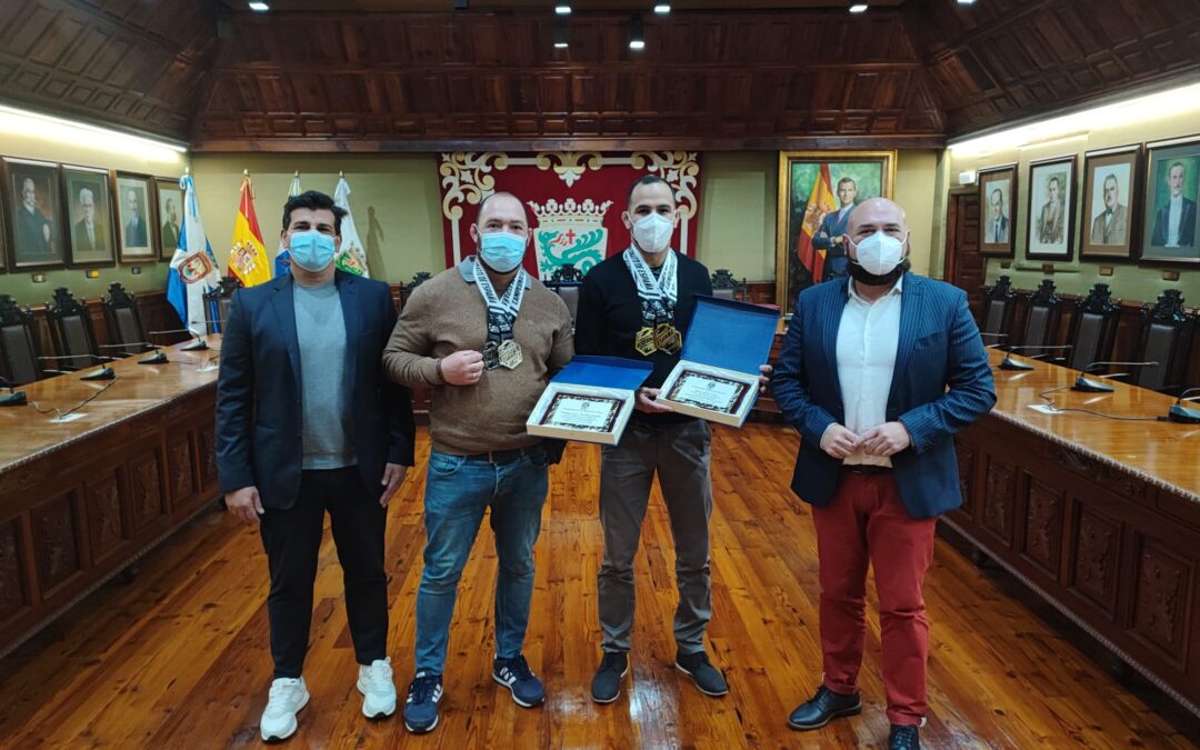 El alcalde de la ciudad Marco Gonzalez junto al concejal de Deportes, Alberto Cabo han recibido a los deportistas portuenses Aaron Martín Torres y Francisco Javier Ceballos del Club Rey Academy BJJ..