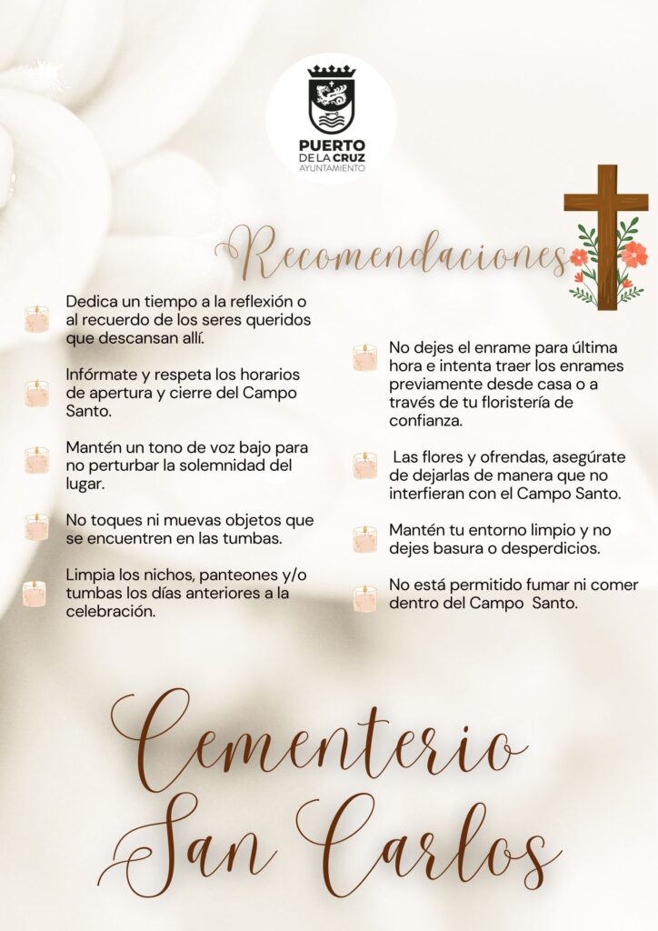 El Ayuntamiento de Puerto de la Cruz, a través del área de Cementerio, ha llevado a cabo diversas labores de acondicionamiento y mejora en el Cementerio Municipal San Carlos con motivo de la conmemoración del Día de Todos los Santos y el Día de los Fieles Difuntos, fechas de especial significado para todos los portuenses.