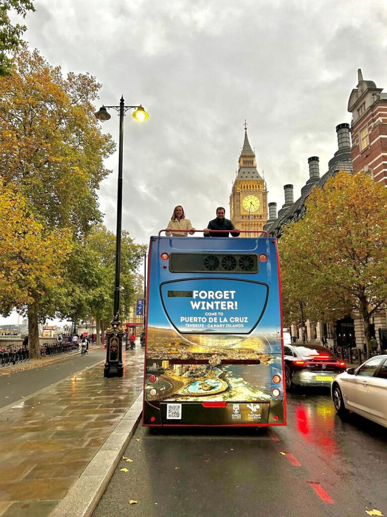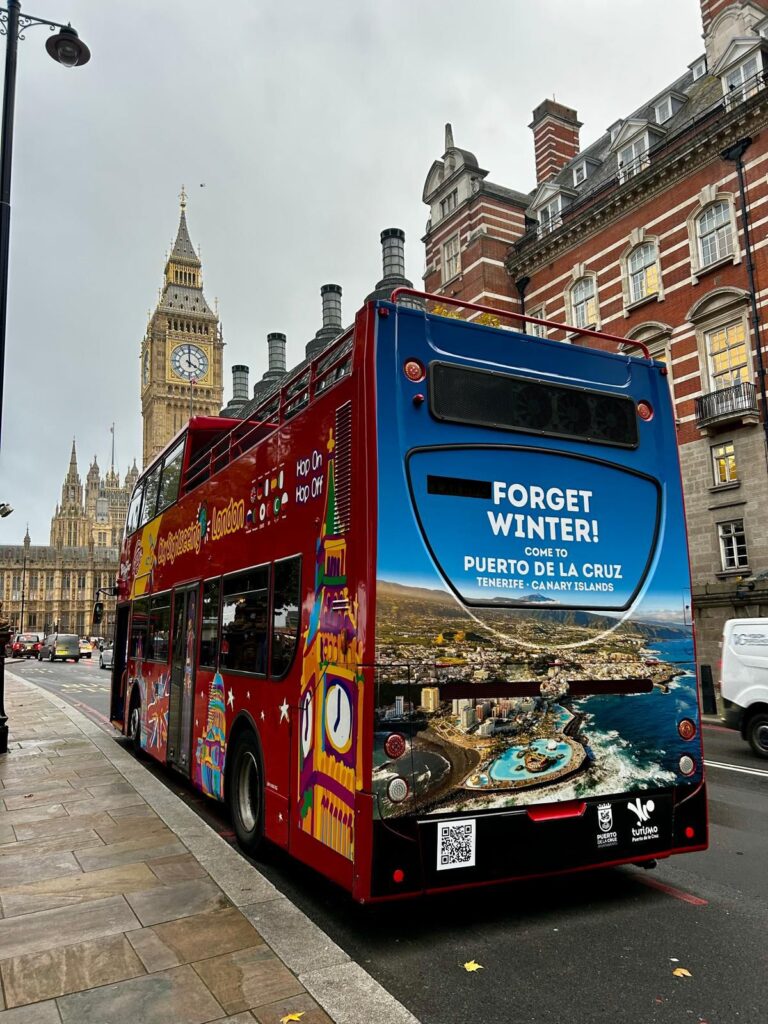 Durante todo el mes de noviembre, una llamativa guagua del City Sightseeing London recorrerá los principales puntos turísticos de la capital británica, llevando la imagen de nuestro municipio a miles de londinenses y visitantes. Una acción promocional que posiciona a Puerto de la Cruz como un destino responsable, con encanto y un clima inigualable.
