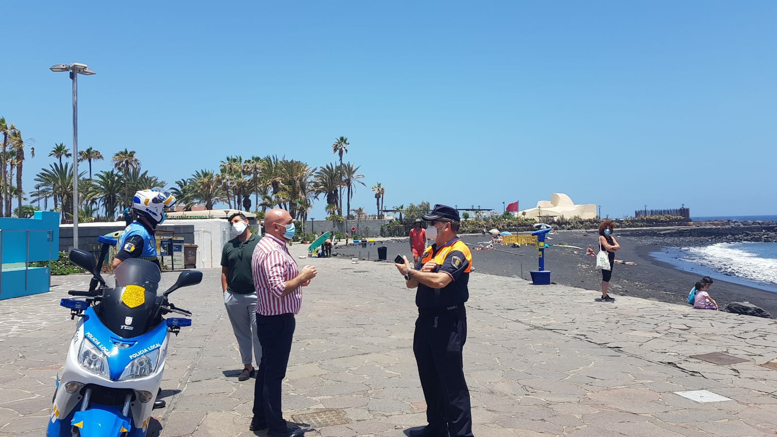Tras la puesta en marcha de la Fase 2, se ha incorporado este lunes el uso de las playas y zonas de baño de la ciudad turística. El alcalde Marco González junto al concejal de Playas Alberto Cabo, visitaron los espacios de baño para comprobar las medidas tanto vigilancia como de información que se han visto reforzadas para cumplir con las medidas de distanciamiento social.
