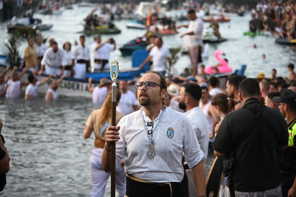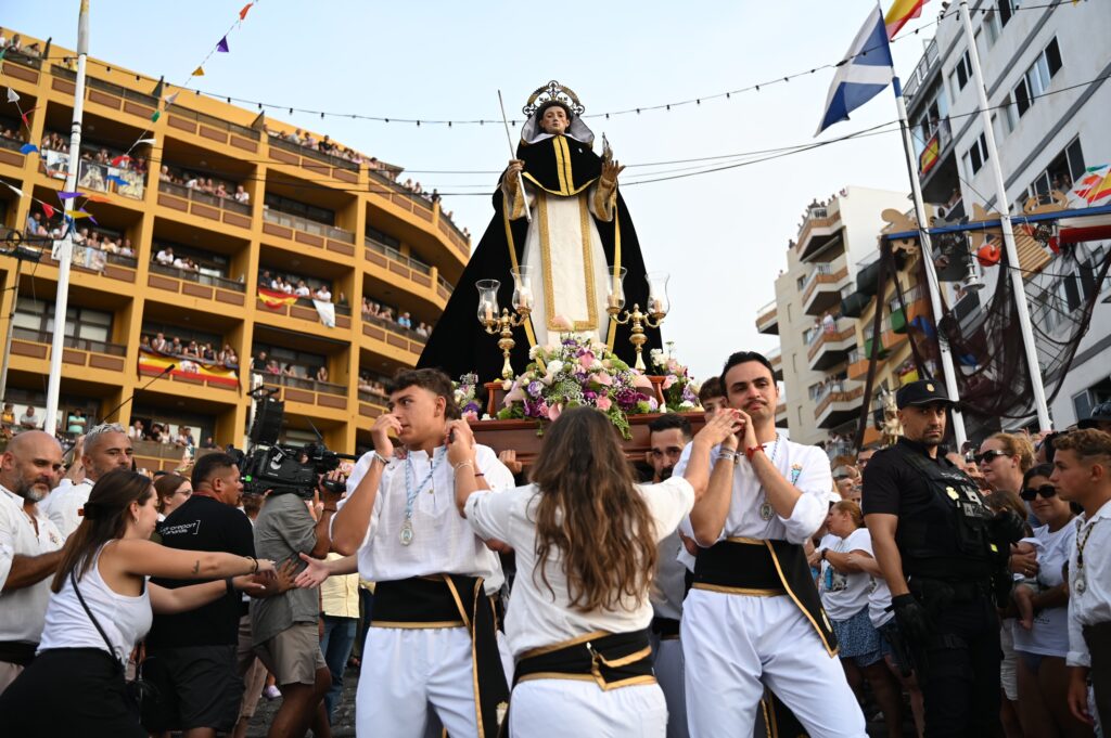 El momento culminante del día tuvo lugar a las 18:00 horas, cuando los cargadores trasladaron las imágenes de la Virgen del Carmen Chiquita y San Telmo Chiquito al muelle pesquero para dar inicio a la procesión marítima. Esta emotiva travesía recorrió el trayecto desde el muelle hasta Punta Brava y de regreso, para luego retornar a la Cofradía de Pescadores, lugar que acoge con devoción estas veneradas imágenes.
