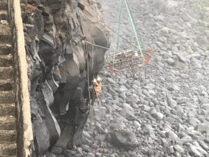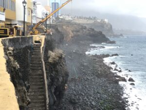 En estos momentos, estamos actuando en las dos primeras cuevas situadas en la mitad de la calle, aproximadamente, realizando “los trabajos de bulonado, poniendo unos hierros desde el mar hasta las casas, que reforzarán toda la vía, para posteriormente hormigonar y tapar las cuevas, además de realizar un fuerte con rocas para evitar que el mar llegue a la zona reparada”, explica el concejal de Urbanismo, Juan Carlos Marrero.