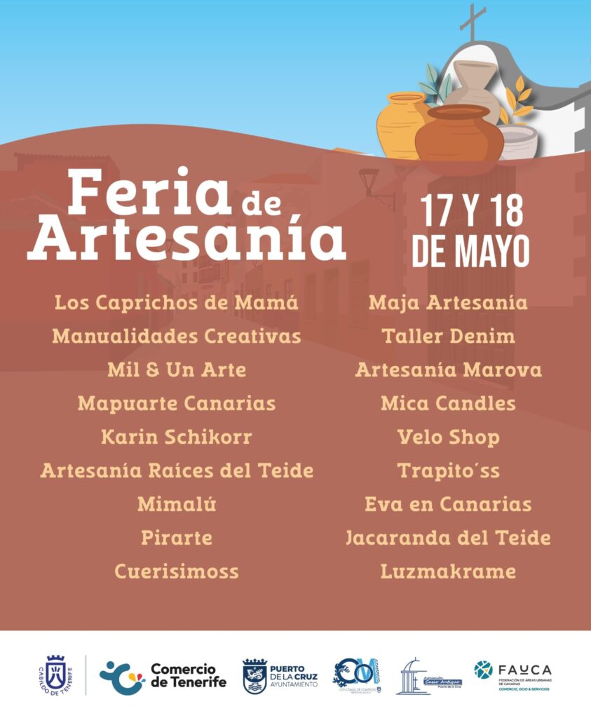 Feria de Artesanía y Manualidades (17 y 18 de mayo): Un espacio para apreciar y adquirir obras artesanales canarias con 18 puestos disponibles, abierta en la Calle Mequinez desde las 11:00 hasta las 20:00 horas.
