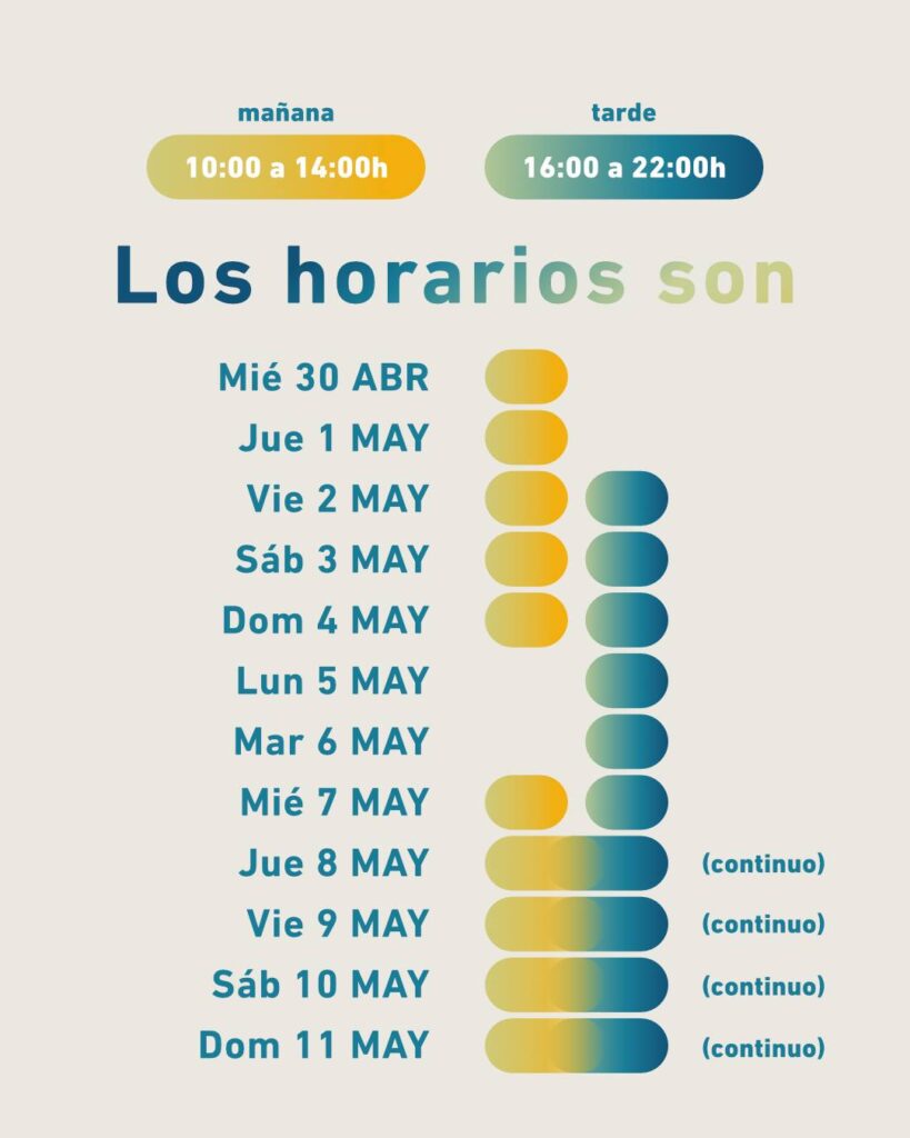 Horario del Punto de Información: – Todos los días: 10:00h a 14:00h y de 16:00h a 22:00h – Excepciones: – Jueves, 1 de mayo: 10:00h a 14:00h – Lunes, 5 de mayo: 16:00h a 22:00h – Martes, 6 de mayo: 16:00h a 22:00h – Domingo, 11 de mayo: 10:00h a 14:00h