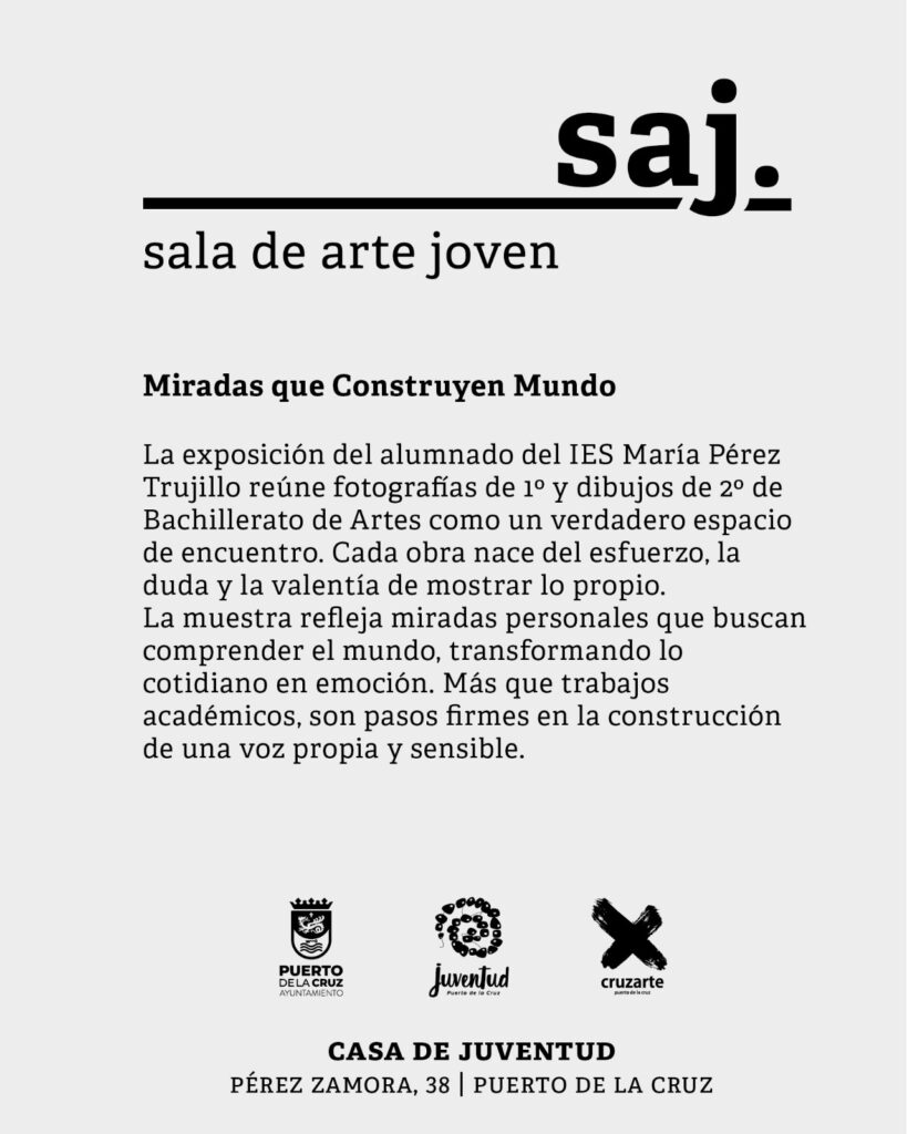 La Casa de la Juventud de Puerto de la Cruz acoge durante este mes la exposición “Miradas que Construyen Mundo”, una propuesta artística organizada por el alumnado del Bachillerato de Artes del IES María Pérez Trujillo que reúne fotografías del alumnado de 1º y dibujos de 2º curso, convirtiendo la Sala de Arte Joven en un auténtico espacio de encuentro entre creatividad, aprendizaje y expresión juvenil.